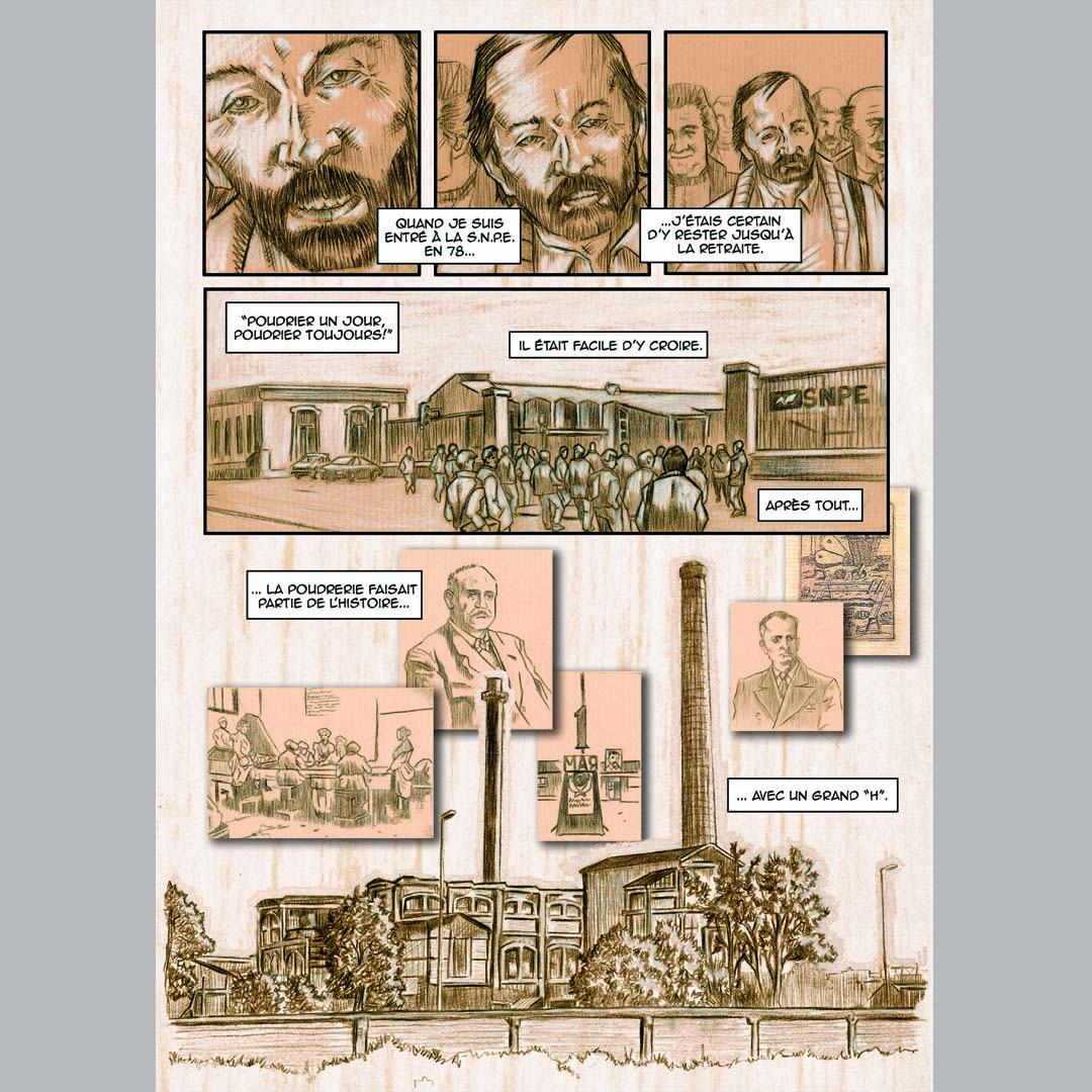 Dans « La Poudrière – Chroniques de la poudrerie de Bergerac », premier tome d’une série qui devrait en compter sept, il revient sur l’année 1992, marquée par le premier grand plan de licenciements. « J’ai choisi cette année car après cela bascule dans une autre histoire, dans la mondialisation, explique celui qui est installé à Bergerac depuis quinze ans. C’est la fin du lien entre les ouvriers et l’État. »