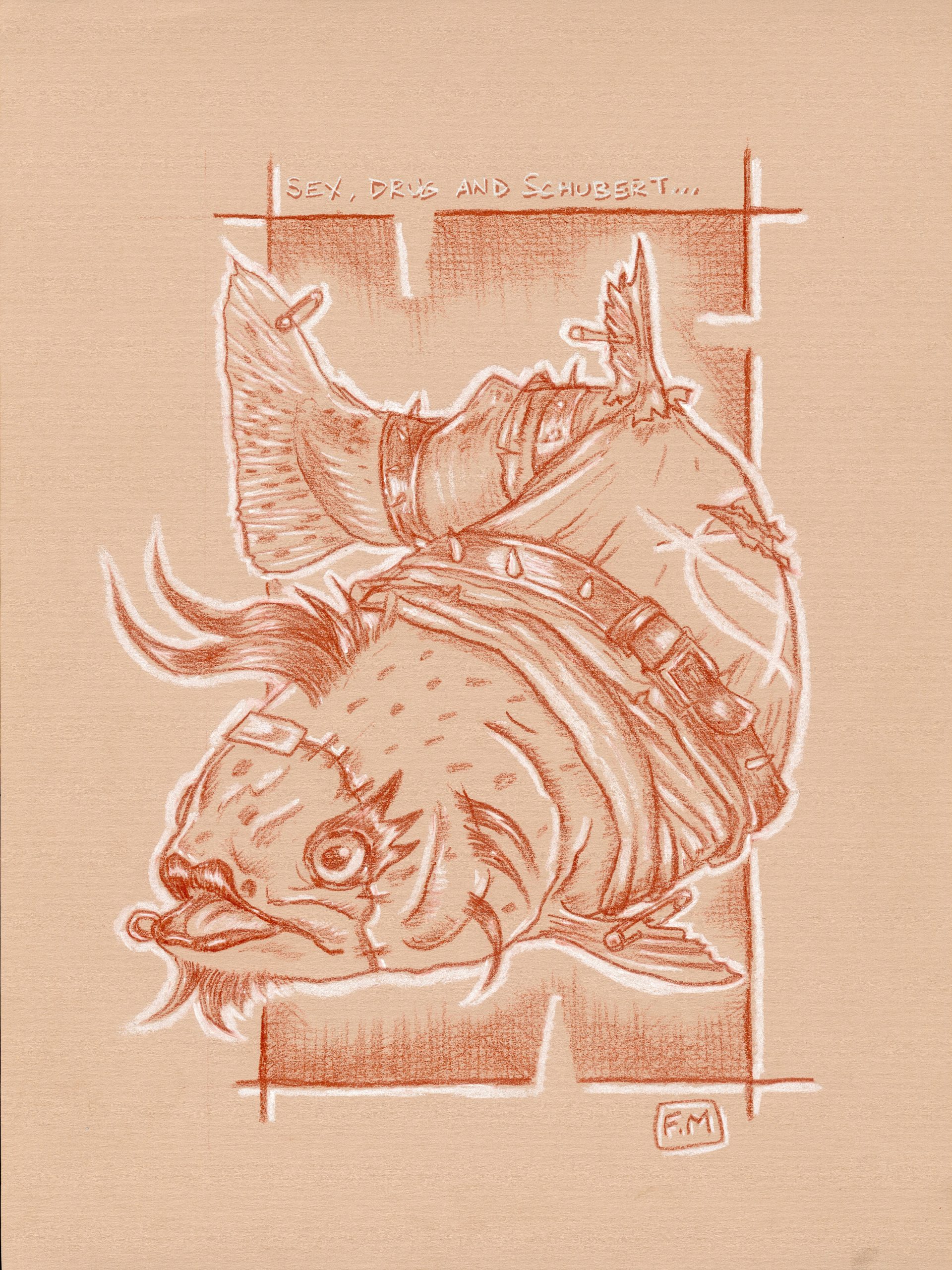 « Sex, Drug and Schubert » – Sanguine sur papier kraft – 40 cm X 30 cm
