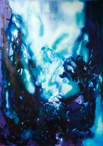 qu’elle voit… autrement. Elle a vécи au bord de la mer, alors sa prédilection, c’est l’eau, mieux… sous l’eau, en apnée. « Sous l’eau je deviens l’eau », elle se concentre sur elle-même, elle crée d’abord dans sa tête, son esprit, son cœur, c’est le moment où naissent les idées l’appel des profondeurs et leurs mystères, et de retour sur terre, elle met ses pensees, ses meditations en couleurs : du bleu, un monde paisible, serein. Mais aussi, par contraste, de l’orange, le feu, qui exprime les passions.